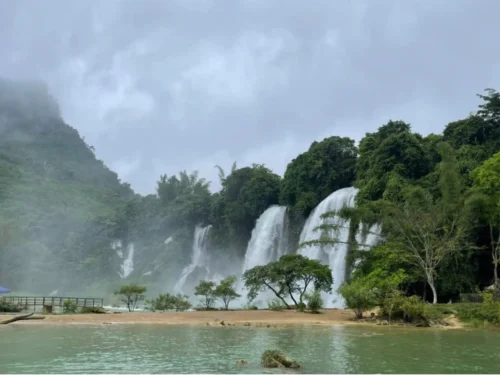 Điểm nhấn của chuyến đi chắc chắn là Thác Bản Giốc, nơi dòng thác đổ xuống trắng xóa giữa khung cảnh núi non hùng vĩ, tạo nên một bức tranh thiên nhiên đẹp như mơ. Dưới chân thác là dòng sông Quây Sơn xanh biếc, hiền hòa, là ranh giới tự nhiên giữa Việt Nam và Trung Quốc. Du khách có thể ngồi thuyền trên sông, tận hưởng không khí trong lành và cảm nhận vẻ đẹp ngoạn mục của dòng thác từ cự ly gần.